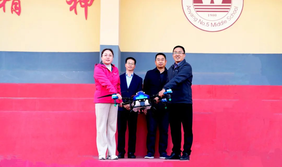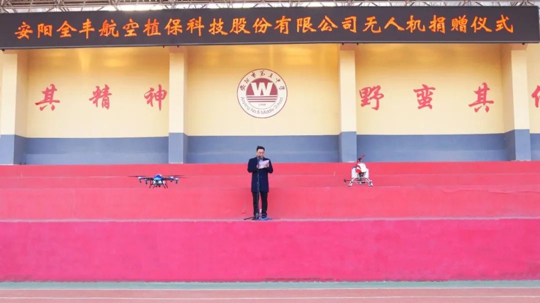 3月21日下午“安陽全豐航空植保科技股份有限公司無人機(jī)捐贈儀式”在安陽市第五中學(xué)操場舉行,安陽市農(nóng)業(yè)農(nóng)村局三級調(diào)研員吉福兵,安陽全豐副總經(jīng)理、研發(fā)中心主任徐雪松,安陽市第五中學(xué)校長王艷軍、副校長王國戍及七年級師生參加了此次捐贈儀式。