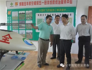海南省農(nóng)業(yè)廳廳長江華安,海口市農(nóng)業(yè)局局長林勁一行于元宵佳節(jié)之際考察、慰問海南輝隆全豐五一田洋航空植保統(tǒng)防統(tǒng)治服務(wù)中心?! ≡谌S航空植保鄧經(jīng)理的講解下,了解了無人直升機(jī)的性能續(xù)航能力,并觀看了全豐無人機(jī)在農(nóng)作物上的現(xiàn)場作業(yè)演示,對(duì)全豐無人機(jī)的***性能和公司的科研創(chuàng)新力度給予了高度認(rèn)可。 在了解了航空植保兩年來的發(fā)展后,和我們工作人員一一握手,并表示要大力支持航空植保在海南的發(fā)展。