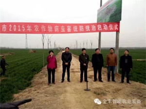 2015年3月4日,許昌市春季農(nóng)作物病蟲害統(tǒng)防統(tǒng)治啟動(dòng)儀式在焉陵縣舉行。市農(nóng)業(yè)局各區(qū)縣農(nóng)業(yè)局局長及植保站站長,許昌市大型植保***合作社理事長及相關(guān)人員二百余人參加了此次啟動(dòng)儀式?! “碴柸S航空植保科技有限公司獲邀參加,在啟動(dòng)儀式現(xiàn)場,全豐航空植保的無人植保機(jī)吸引了與會(huì)人員的目光,在技術(shù)人員的操作下,農(nóng)用無人機(jī)在小麥上方處不停的折返,其工作效率遠(yuǎn)遠(yuǎn)高于人工。表現(xiàn)出優(yōu)越的性能,令參觀者驚嘆。